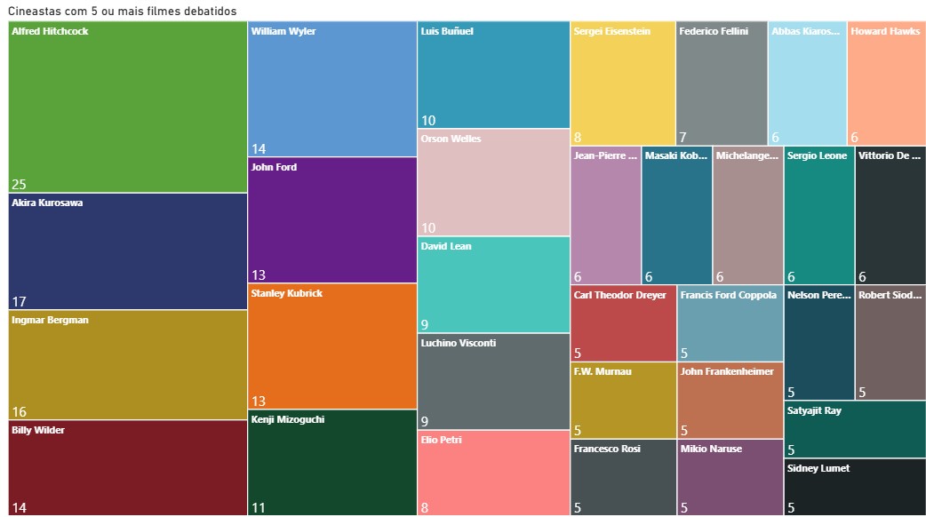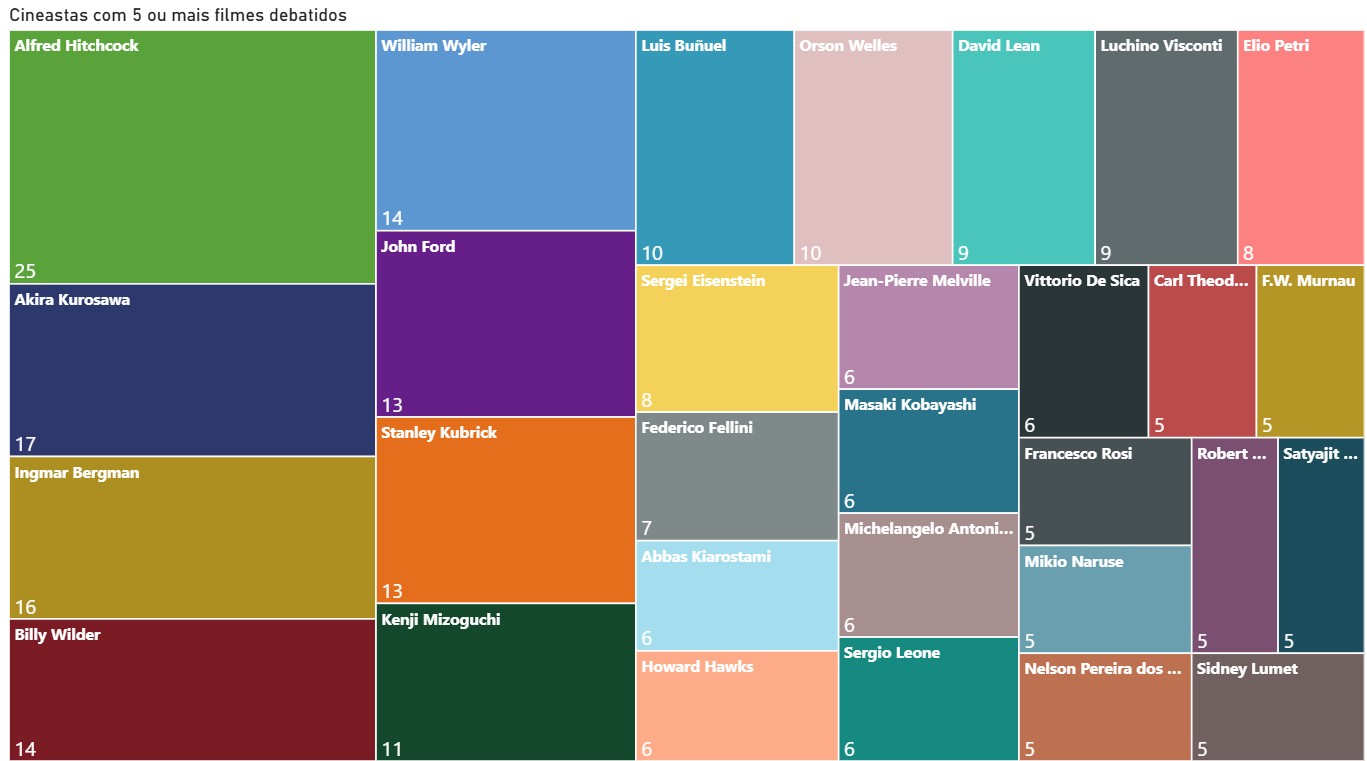 Este gráfico apresenta os diretores que tiveram mais filmes comentados pelo nosso podcast. Por conta de espaço na visualização, filtramos os cineastas que tiveram 5 ou mais obras debatidas por aqui.