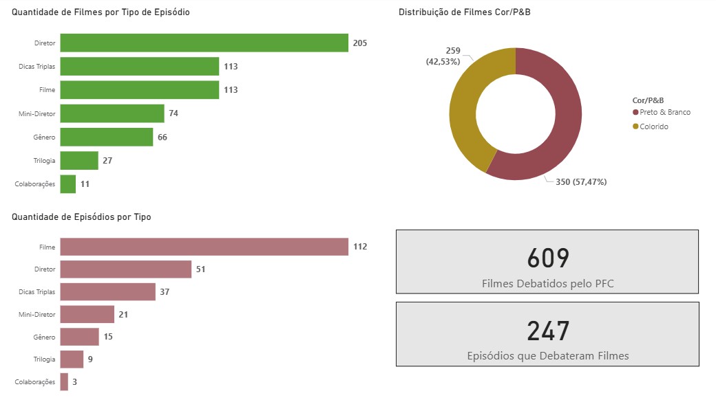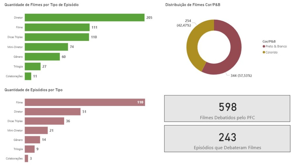 Nestes gráfico apresentamos a distribuição de filmes por tipo de episódio, se coloridos ou P&B e a quantidade de episódios por tipo. Fazemos também a contagem de quantos filmes foram debatidos no PFC e em quantos episódios isso aconteceu.