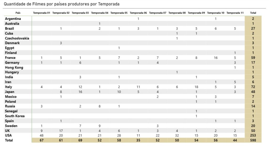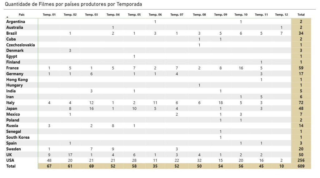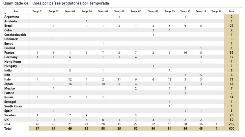Esta tabela apresenta como está a distribuição dos países que produziram os filmes divididos por cada temporada do PFC. Atualmente estamos na nona temporada de nosso Cast, que já tratou de produções de diversos países.