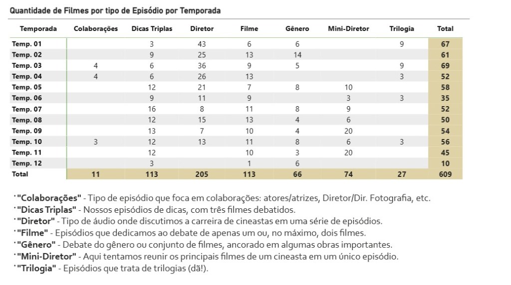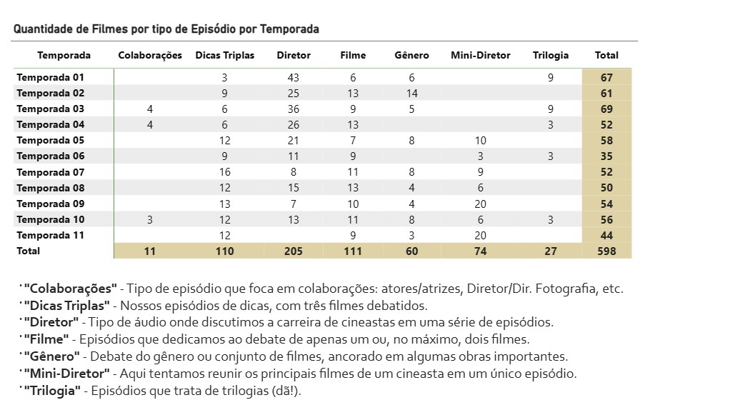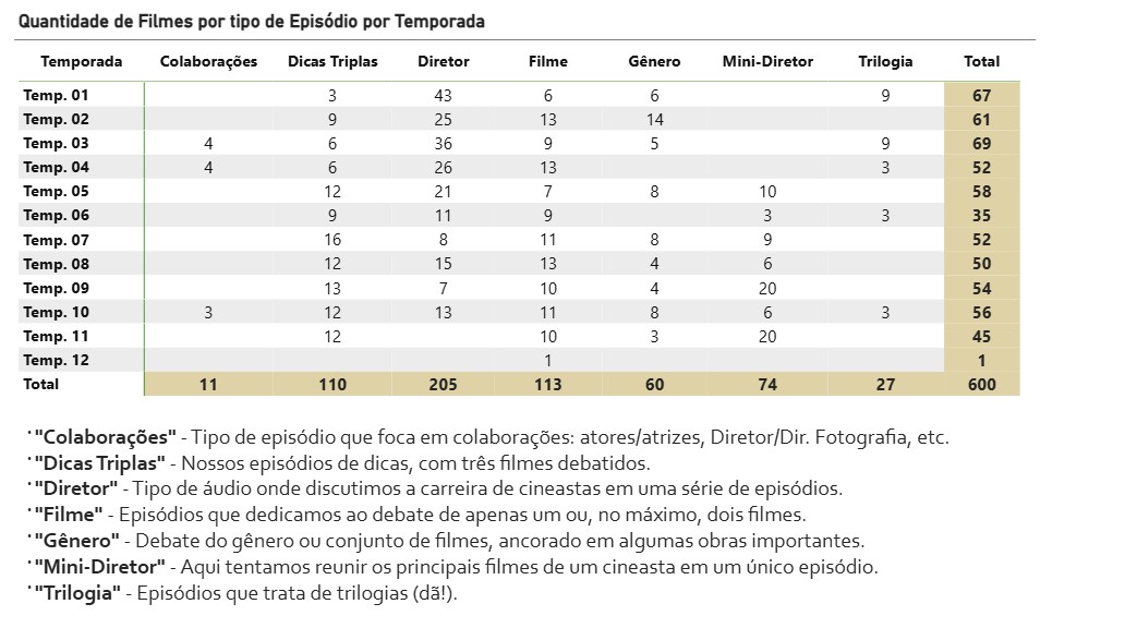 Esta tabela mostra quantos filmes foram debatidos em cada tipo de episódio (dicas, gêneros, Biografias, Filmes, etc) que fizemos, distribuídos em cada temporada do nosso Podcast.